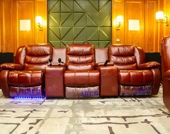 一整套的服务流程,当然也包括影院沙发,这款采用3+1+1座的电动真皮沙发,沙发中间设有可调节按钮,可以根据业主观影状态以调节躺卧的舒适程度,通过人体工程学将座椅结构、座感的软硬,坐高的尺寸、后背的高低、角度的倾斜设计到状态,沙发上方筒装设计可以放置零食、眼镜、水等方便使用,美观又好用。